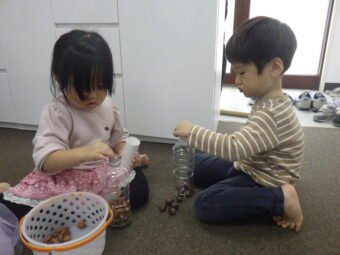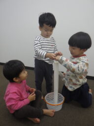散歩バックを機に、新たな遊びを見つけるこどもたちです。