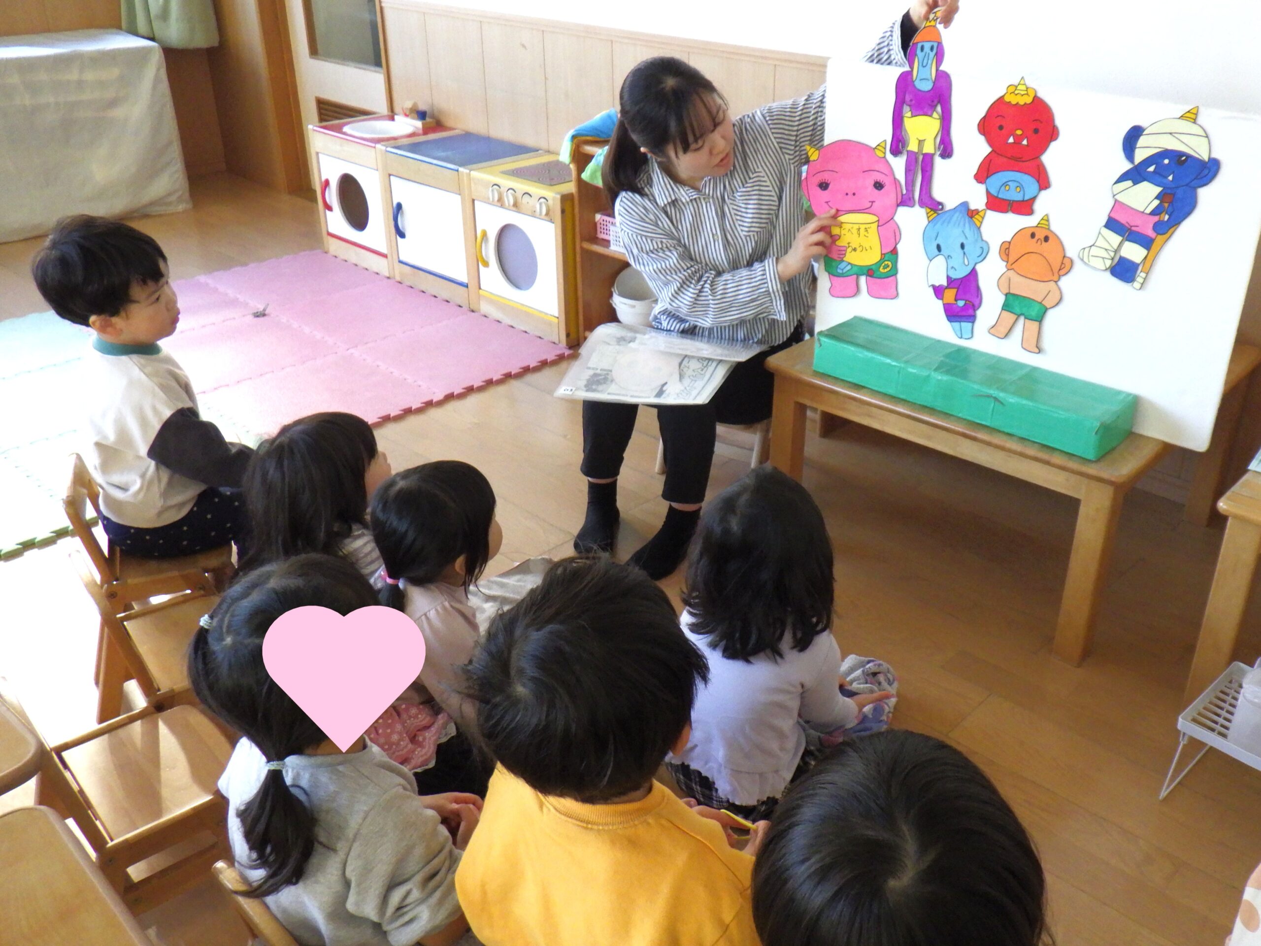 保育士が「みんなの中にいる鬼もやっつけようね」と話すと、
