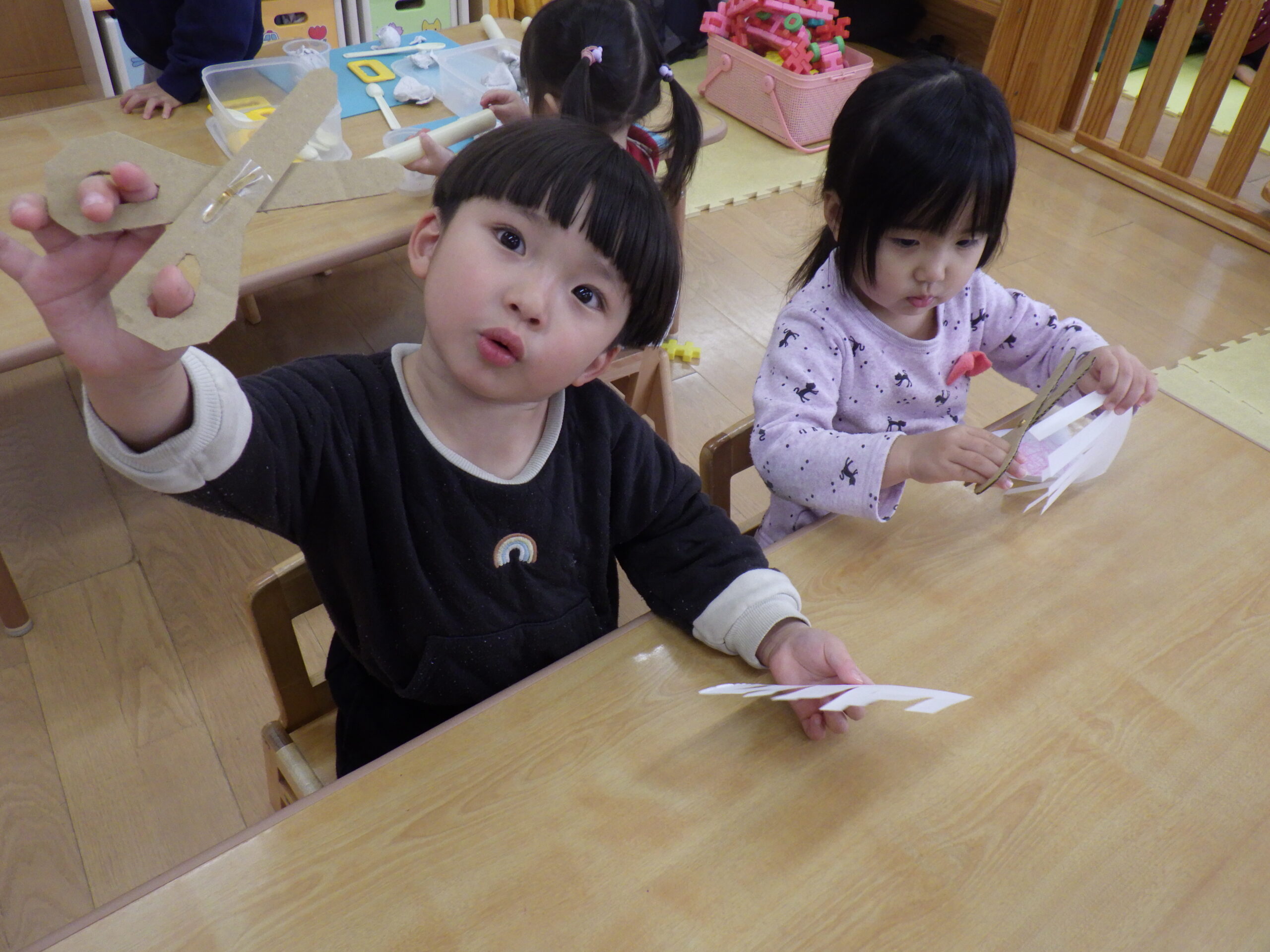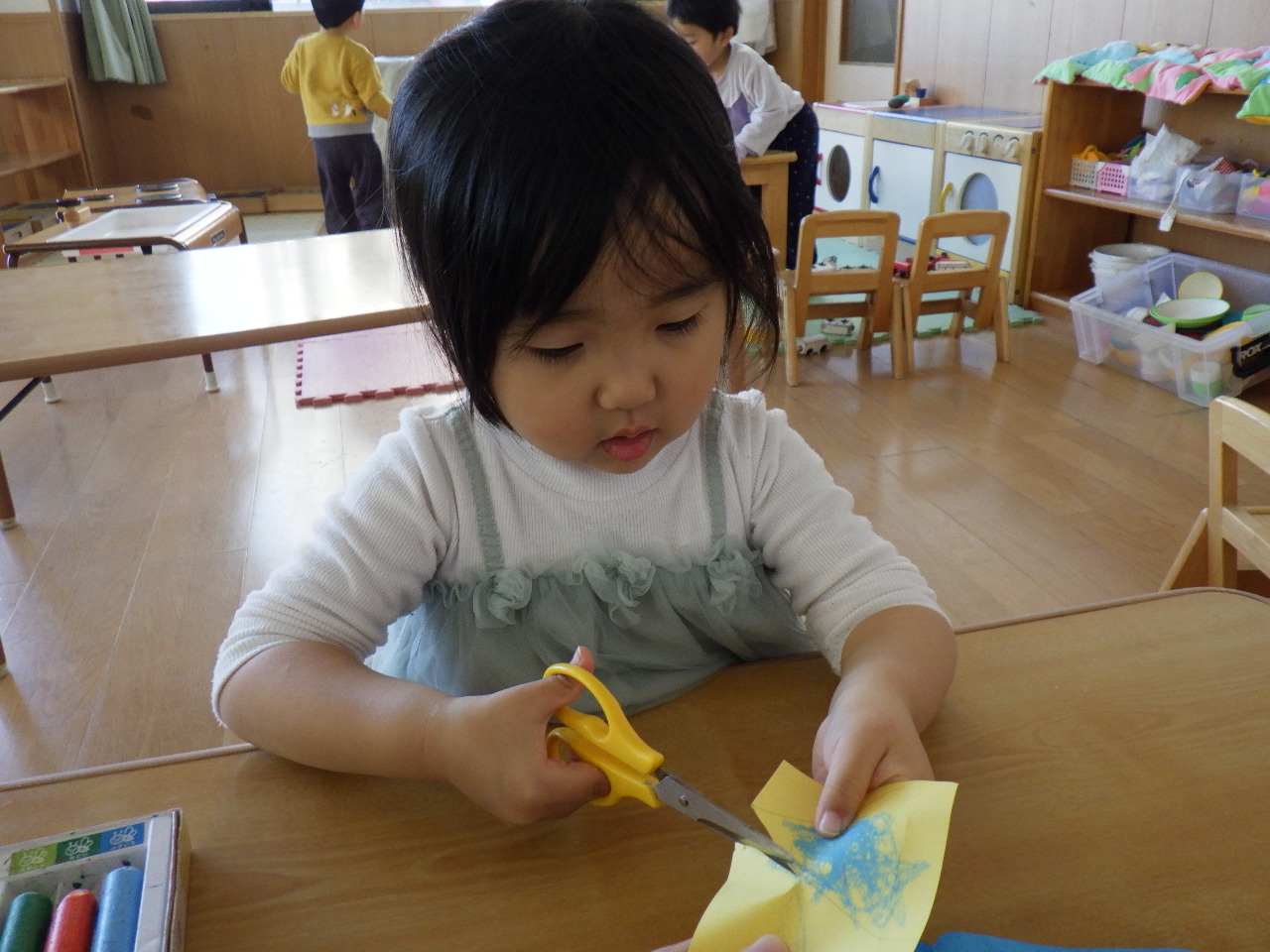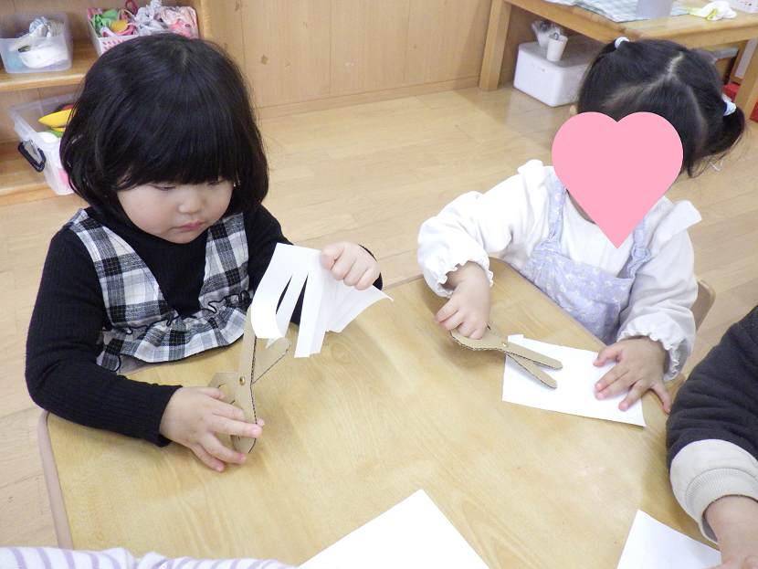 「ちょきちょき」「開いて、閉じて」などと声に出しながら、懸命に手を動かし