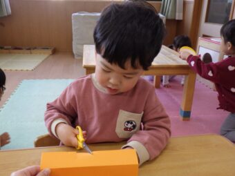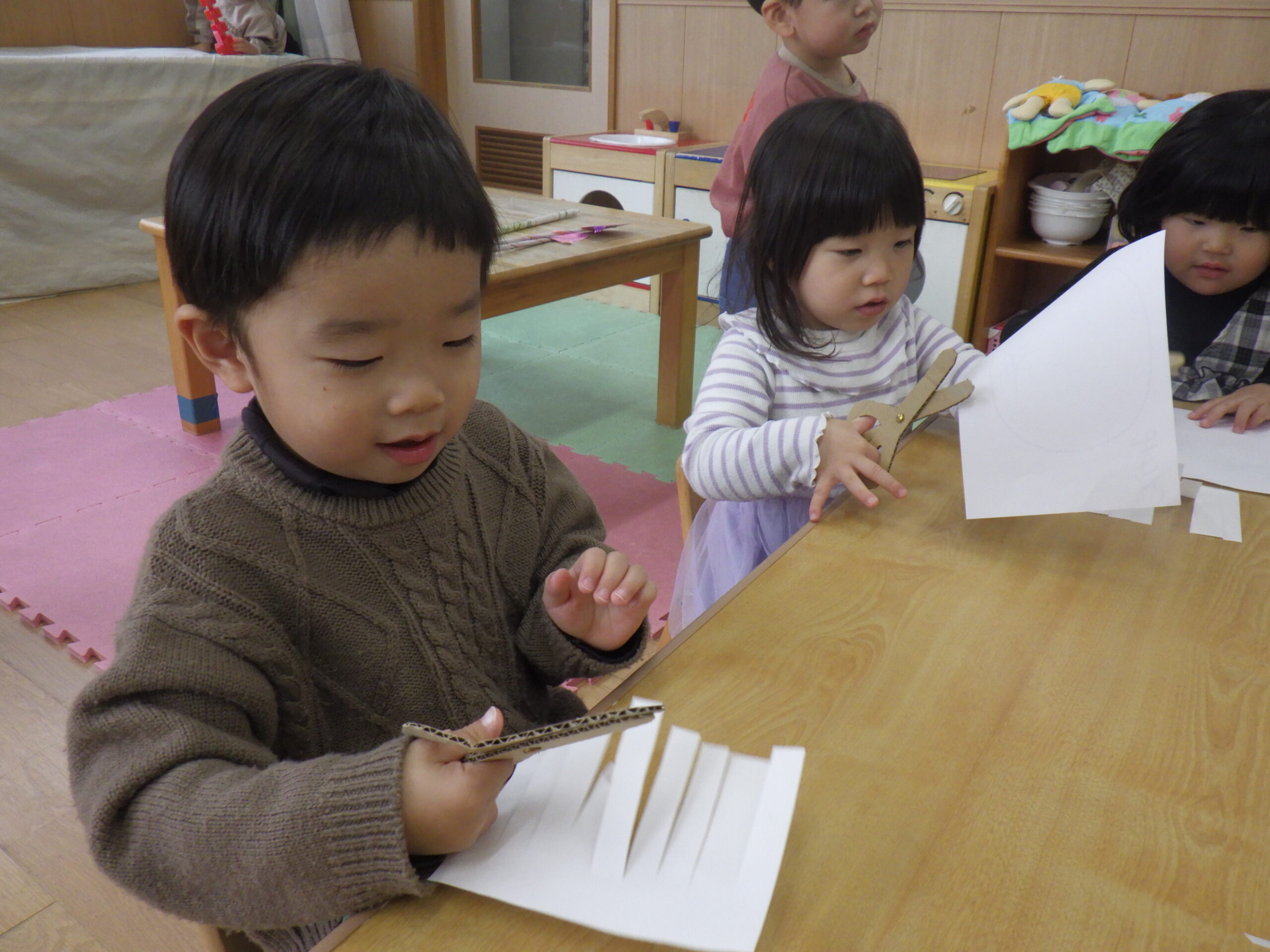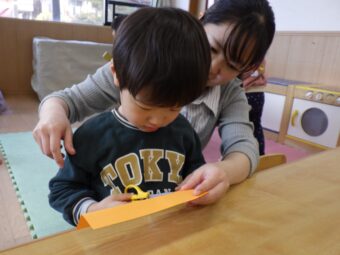 次に、反対側の手で事前に保育士が切り込みを入れている紙を持ちながら、