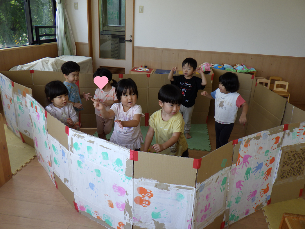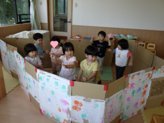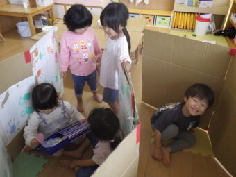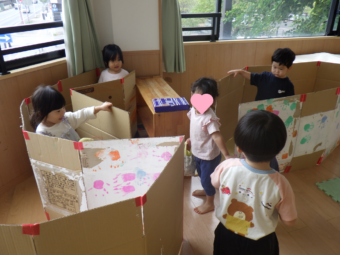 さっそく、ダンボールを立てかけて囲いを作り、おうちごっこの始まりです!