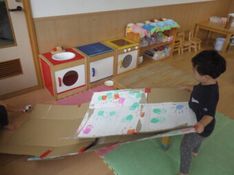 転がす玩具のダンボールを室内遊びで活用しました。