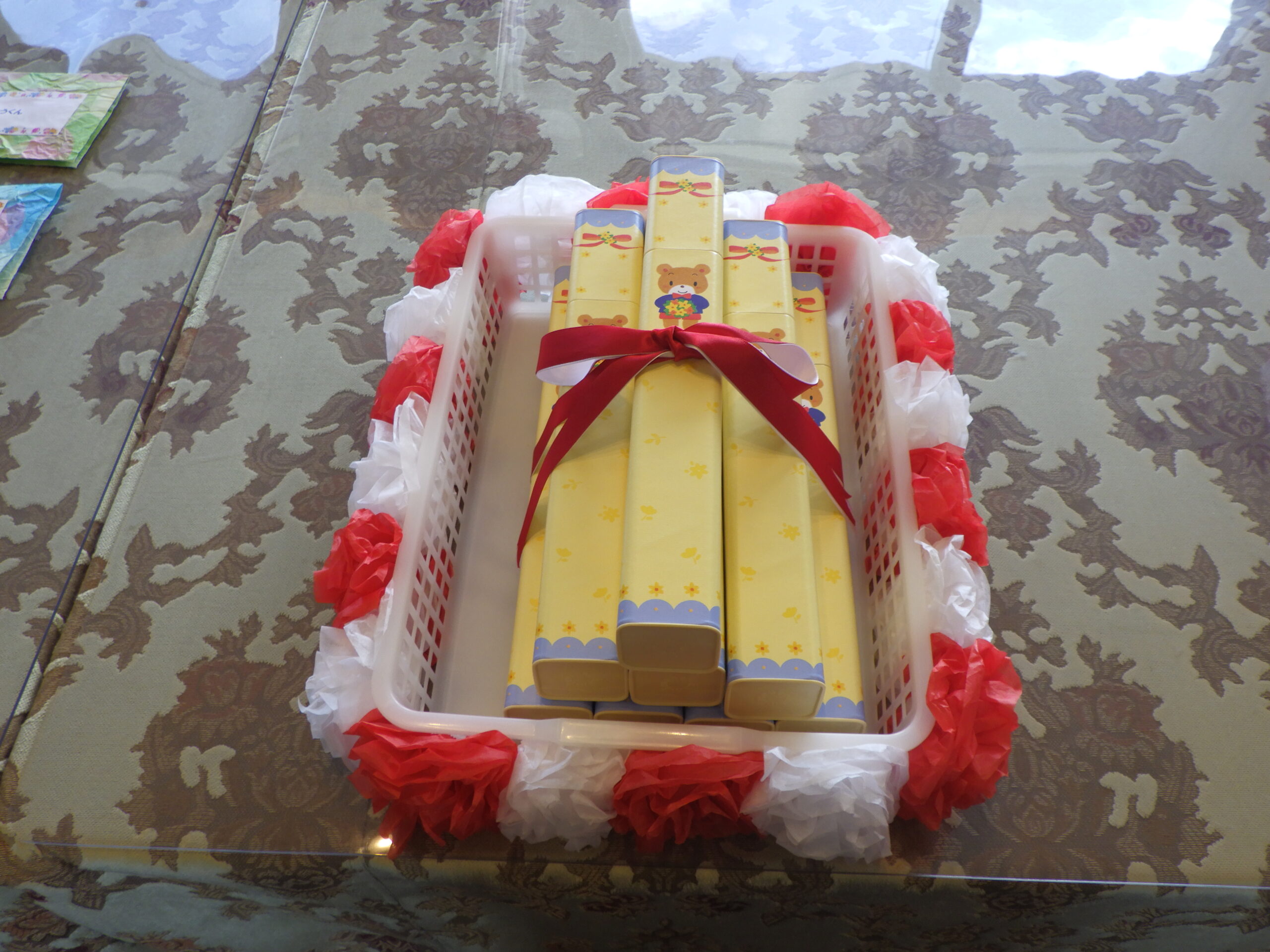 「お祝いのお手紙」の台紙は、こどもたちがお花紙を使って作りました。