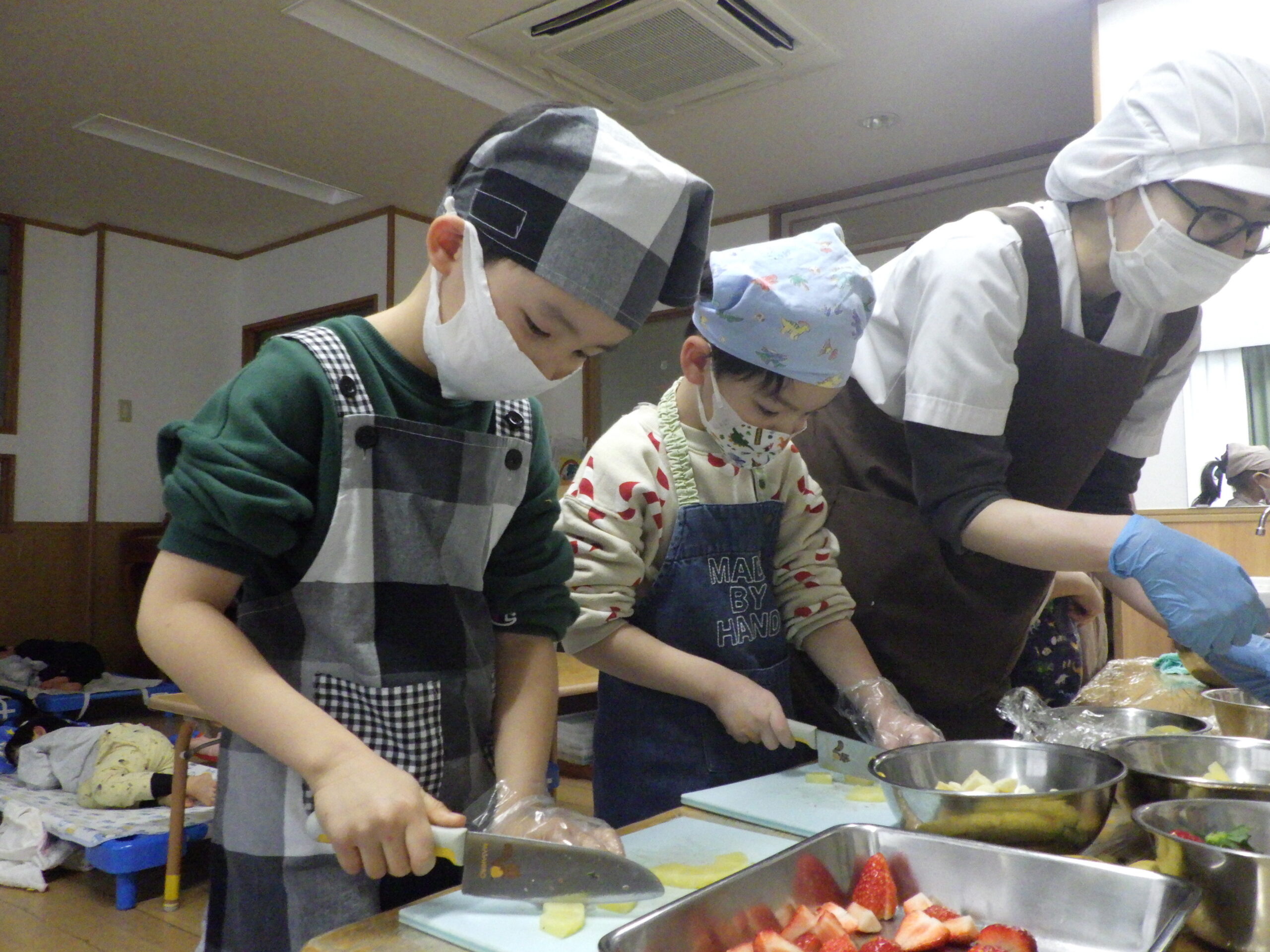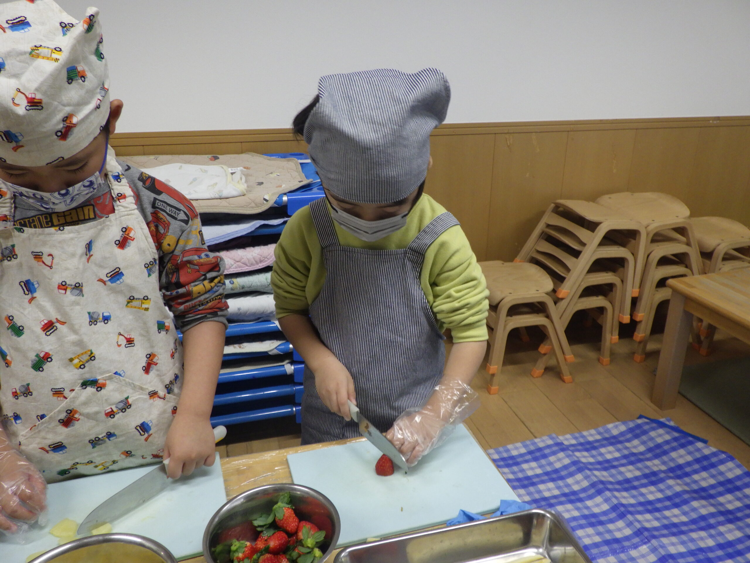 パフェに乗せる果物を、包丁で切ることに挑戦しました。